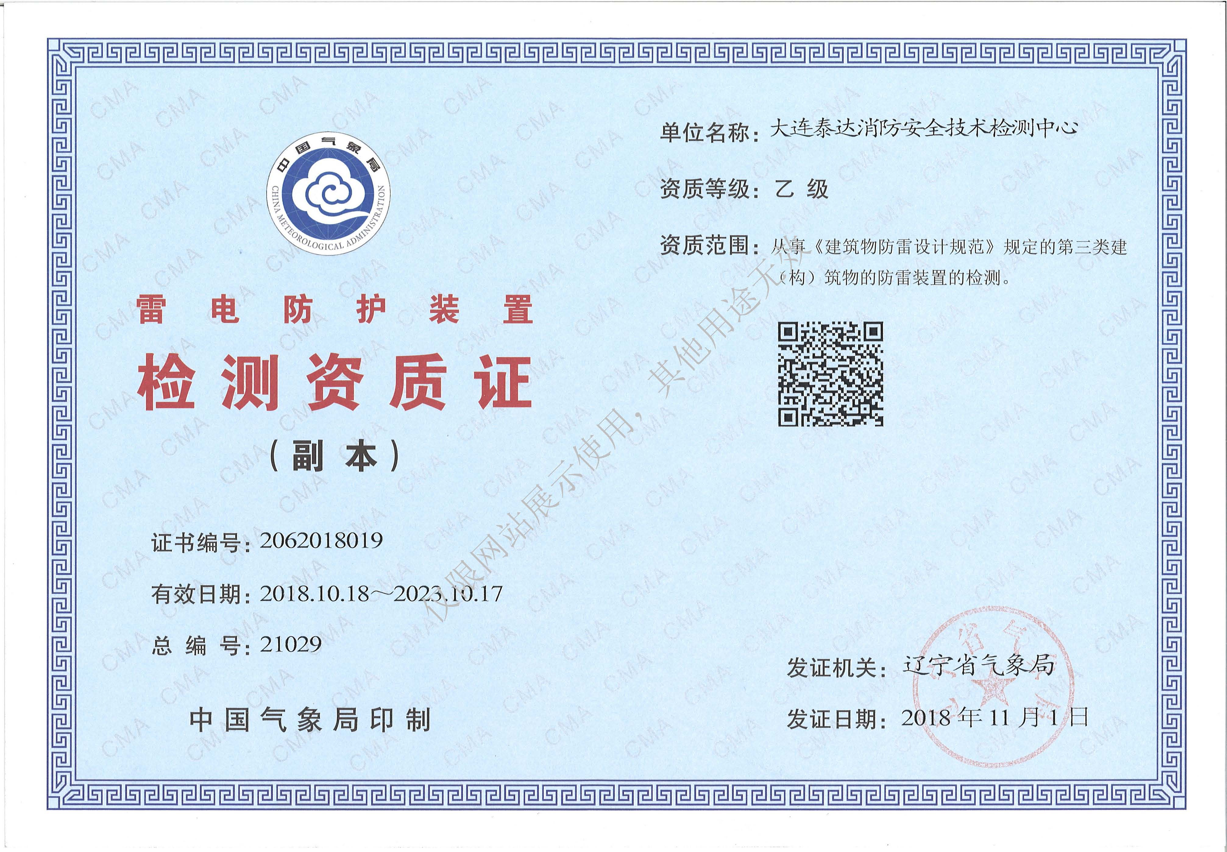 · 是經“社會消防技術服務信息系統”備案并公示的消防技術服務機構,已取得中國氣象局頒發的雷電防護裝置檢測資質證書、遼寧省質量技術監督局審核批準的檢驗檢測機構資質認定證書(CMA)及包括消防檢測、電氣檢測、雷電防護裝置檢測、防火涂層厚度檢測等在內的200余項檢驗檢測能力,取得大連市應急管理局頒發的安全生產標準化證書,獲得質量管理體系、環境管理體系、職業健康安全管理體系認證證書,是經備案的高新技術企業,可獨立出具具有證明作用的檢測報告。